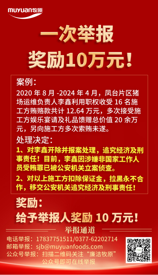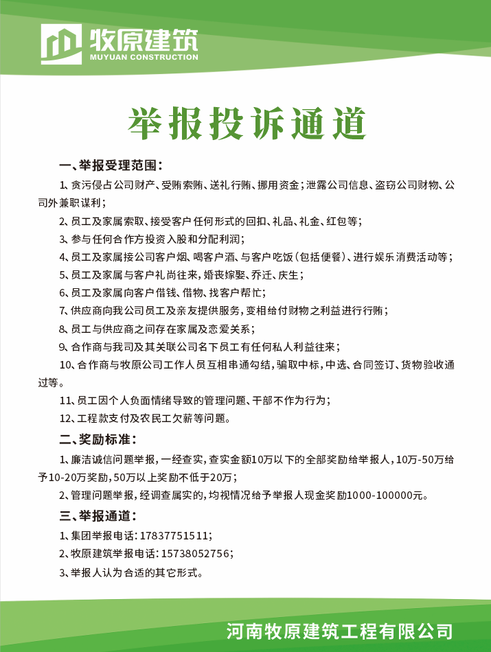 以制度透明筑牢防線,以監督機制激發自覺。牧原建筑明確表示:廉潔誠信不僅是合作的“硬門檻”,更是企業公民的社會責任。對違規合作商堅決實施“一票否決”。同時,全面開放舉報通道,設立“廉潔誠信踐行獎”(內外獎勵標準一致),構建全員參與的監督網絡。此舉旨在推動合作商從“被動合規”轉向“主動履責”,使廉潔誠信內化為行業發展的共同文化基因。